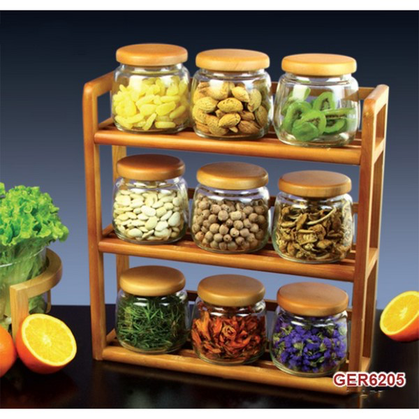 9PCS GLASS SPICE JAR SET W/WOODEN RACK-0901