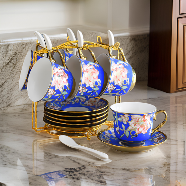طقم شاي خزفي 18 قطعة مع رف - 200 مل × 6