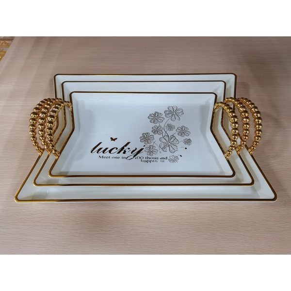 WHITE DIAMOND SHAPED 3 PCS PLASTIC TRAY SET W/BEAD HANDLE-42.5X31.5X3.8